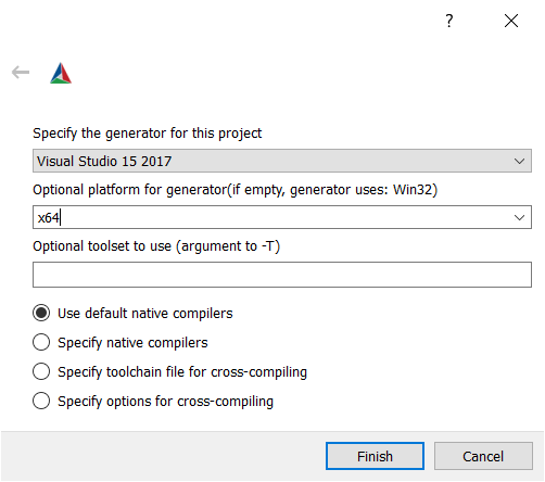 - Windows: when configuring in CMake be sure to set the target architecture to x64 – see image below. NB. (In your IDE) build the code project under either the Release or RelWithDebInfo configuration as the SDK only provides the engine Release binaries.